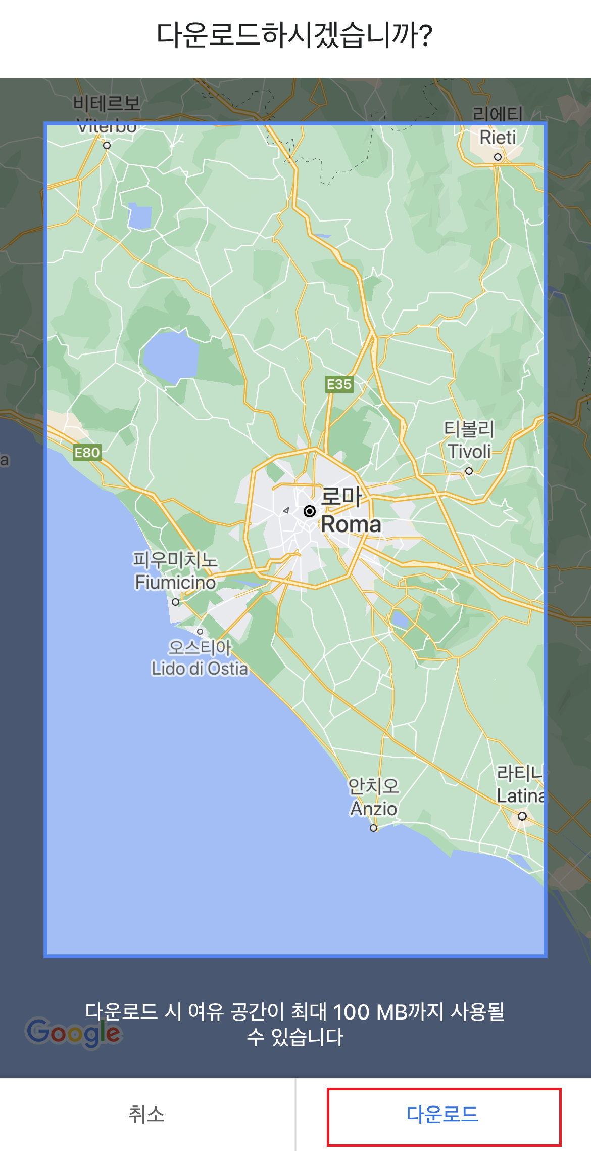 구글지도 오프라인 저장하려는 지역이